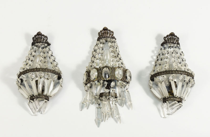 COPPIA DI APPLIQUES - THREE METAL AND CRYSTAL WALL LAMPS in metallo sbalzato...