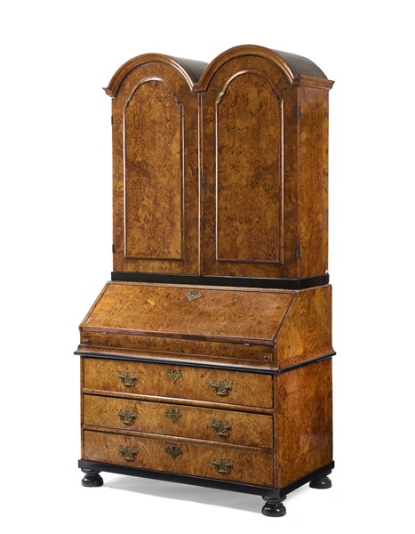 Trumeau lastronato in radica di tuja. Parte superiore a due ante con cimasa bipartita, parte inferiore con profili in legno tinto a tre cassetti con calatoia celante tiretti, vani e segreto, piedi a cipolla. Inghilterra, secolo XVIII (cm 113x227x 64) (restauri)