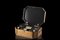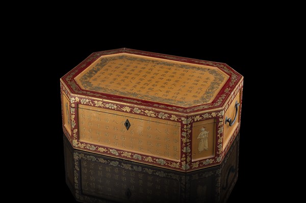 Scatola da cucito, l'esterno laccato in rosso e oro con figure, iscrizioni e bo