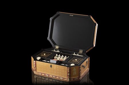 Scatola da cucito, l'esterno laccato in rosso e oro con figure, iscrizioni e bordature a motivi floreali, l'interno laccato in nero con ripiani e contenitori, con accessori in osso