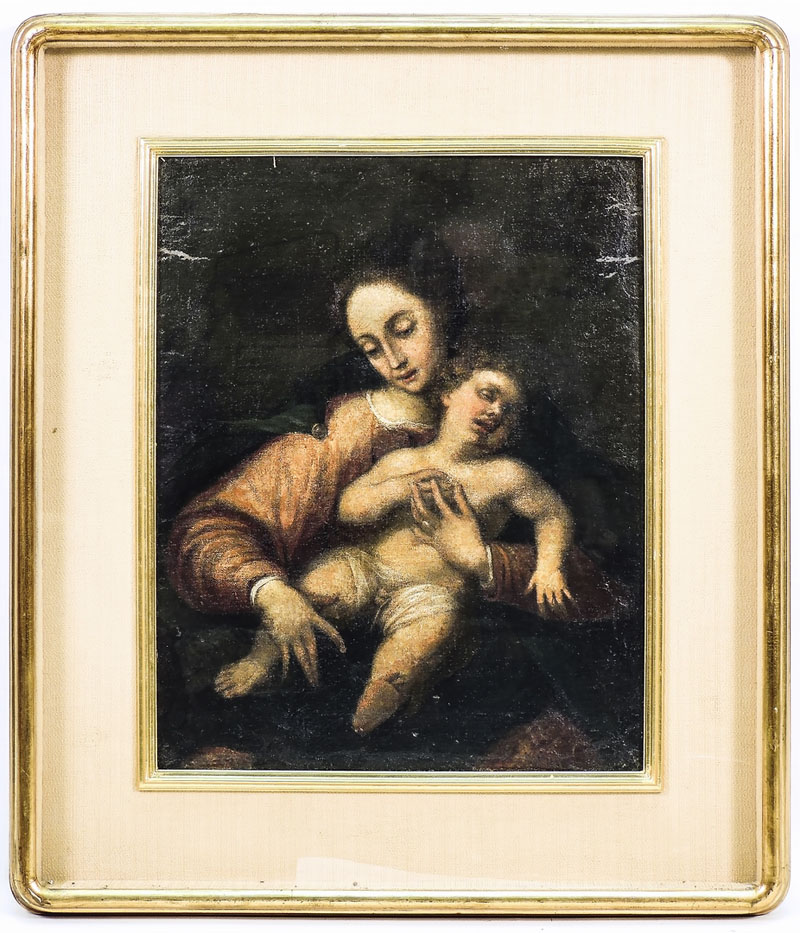 MADONNA CON BAMBINO - THE MADONNA AND CHILD Scuola italiana del XIX secolo - Italian School of 19th Century olio su tela - oil on canvas, in cornice, difetti cm 53x41,5