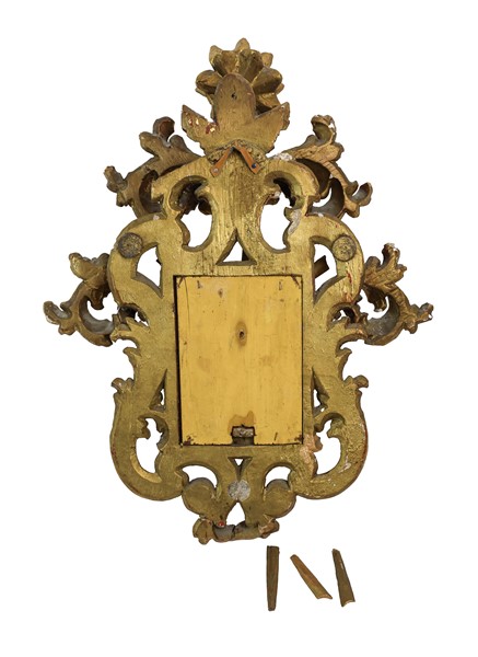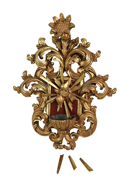 Acquasantiera in legno intagliato, traforato e dorato a volute contrapposte, ce