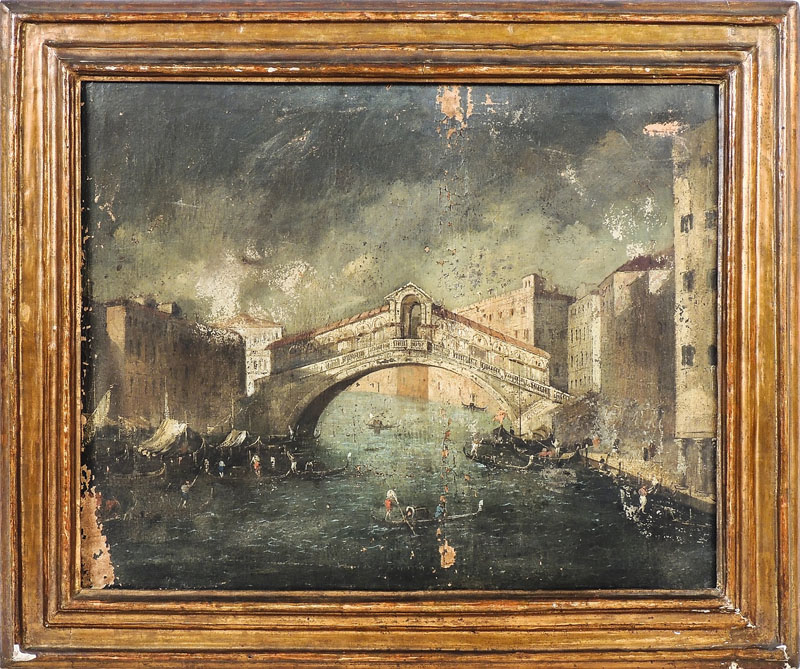 PONTE DI RIALTO A VENEZIA - THE RIALTO BRIDGE IN VENICE Scuola veneta del XIX secolo - Venetian School of 19th Century olio su tela - oil on canvas, in cornice lacerazioni della tela e cadute di colore cm 59x70