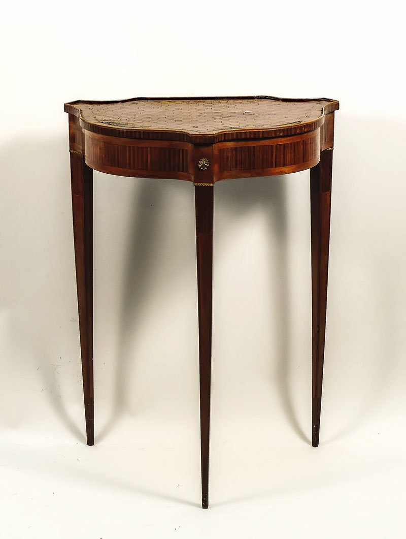 GUERIDON IMPIALLACCIATO IN NOCE - WALNUT VENEERED GUERIDON piano sagomato intarsiato a scacchiera, un cassetto nella fascia, tre gambe a faretra, applicazioni in metallo dorato, difetti h cm 70x51,5x35