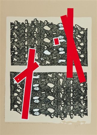Franco Fossi (Empoli 1955) RICERCA DEL CODICE TRAMA SULLE TAVOLE DEL MITO, 1983 Tecnica mista e collage su cartoncino, cm. 101,5x72,5 Firma e data in basso a destra, titolo in basso a sinistra. Autentica dell'Artista su foto.
