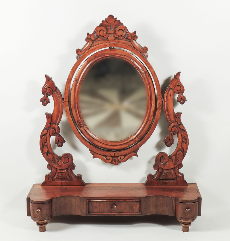PSICHE DA TAVOLO IN NOCE - WALNUT TOILET MIRROR fine del XIX secolo - late 19th Century cornice ovale con cimasa intagliata, sostegni laterali a volute contrapposte, base sagomata con tre piccoli cassetti, piedi a trottola h cm 97x78x24