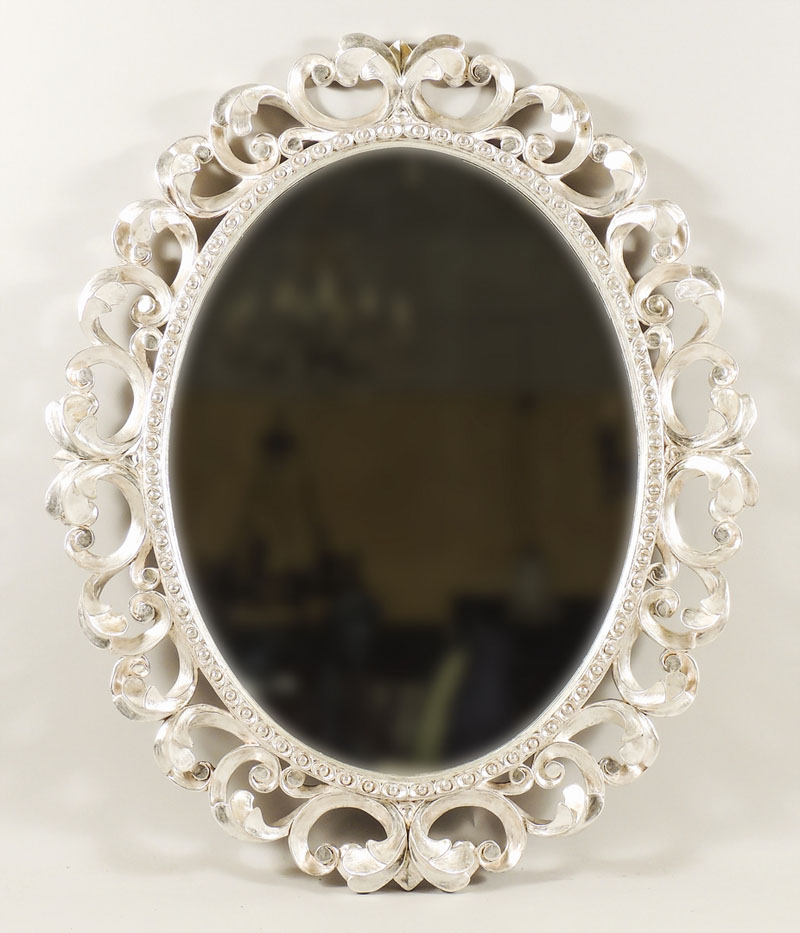 SPECCHIERA OVALE IN LEGNO TRAFORATO E ARGENTATO - SILVERWOOD OVAL MIRROR decorata con volute e girali cm 106x88
