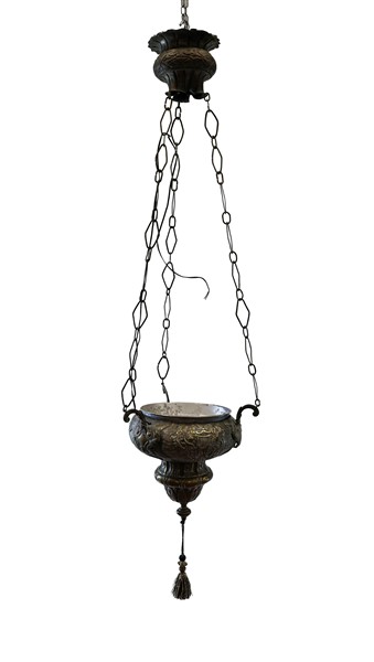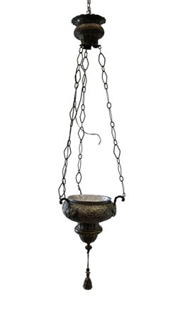 Antico turibolo in metallo argentato, sbalzato e inicso con decoro a volute e c