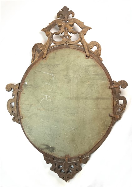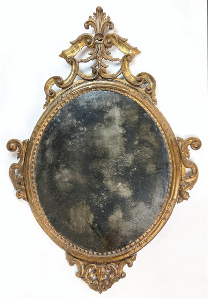 Specchiera di forma ovale in legno intagliato e dorato con fregi a volute contrapposte e bordure unghiate. Secolo XVIII (cm 146x103) (difetti)