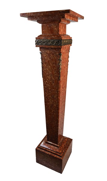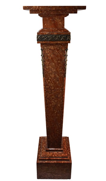 Piedistallo in marmo rosso di Asiago con sostegno rastremato su base a plinto, applicazioni in bronzo dorato (cm 30x115x30) (difetti)