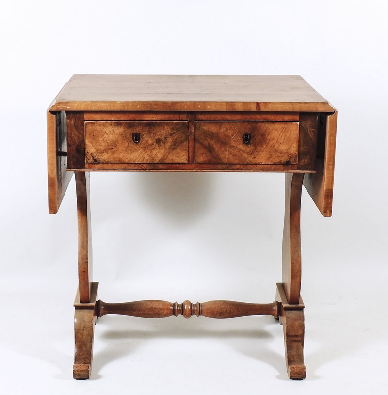 TAVOLINO A BANDELLE IMPIALLACCIATO IN NOCE E PIUMA DI NOCE - WALNUT VENEERED DROP-LEAF TABLE due mezzi cassetti nella fascia, sostegni a lira poggianti su piedi mossi h cm 75,5x72x50