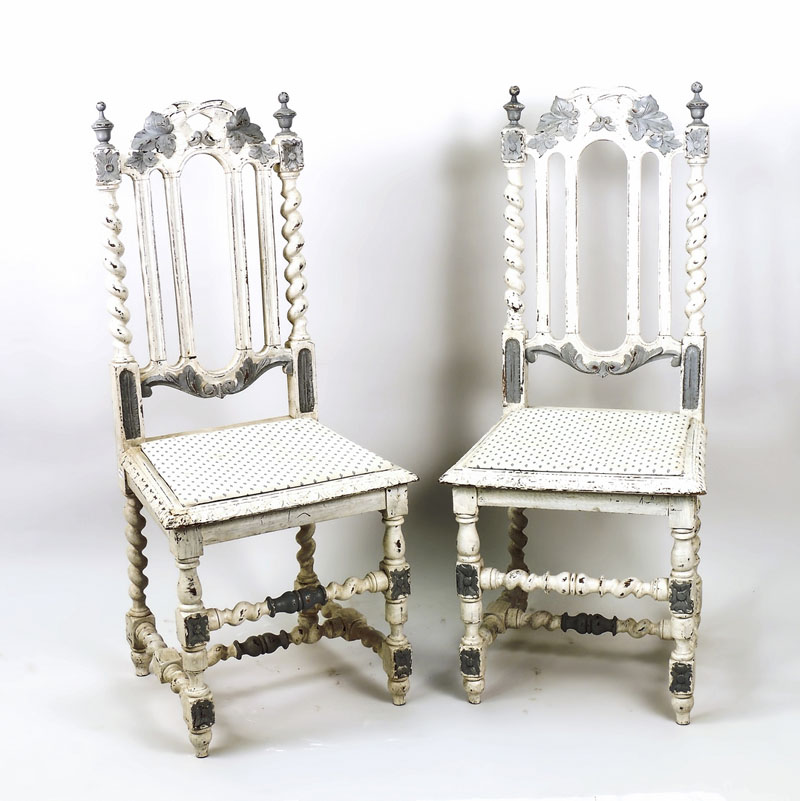 SERIE DI QUATTRO SEDIE IN LEGNO TENERO LACCATO BIANCO E GRIGIO - A SET OF FOUR LACQUERED CHAIRS inizio del XX secolo - early 20th Century sostegni a torciglione, sedili rivestiti in tessuto