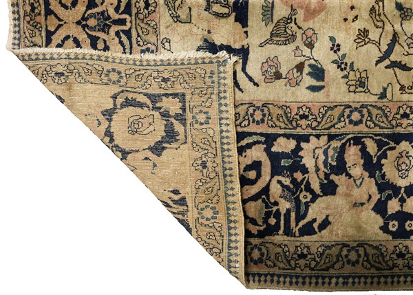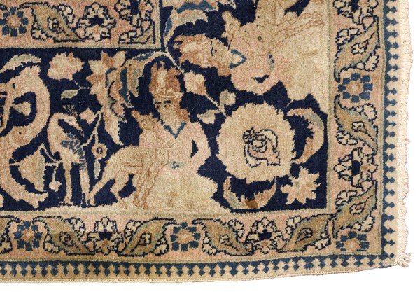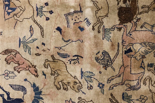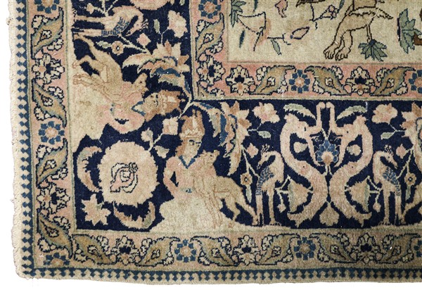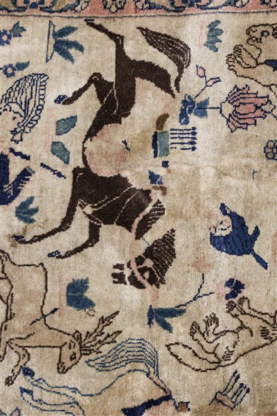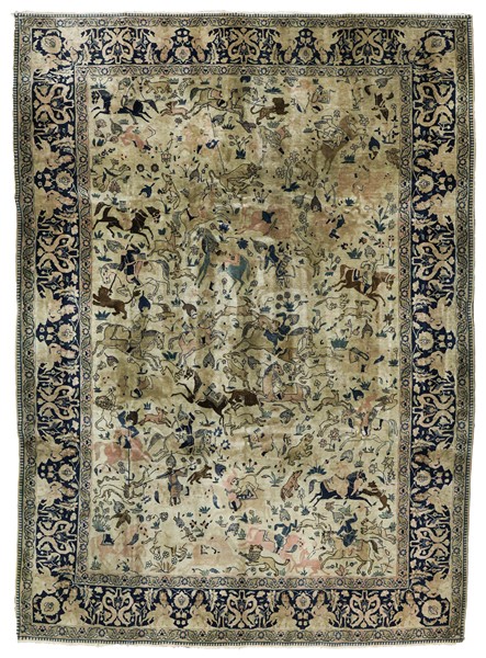 Tappeto Keshan, scuola di Mothashem, Persia, secolo XX. Decoro pittorico con cavalieri, fiere e animali sviluppati anche nella bordura principale (cm 348x263) difetti)