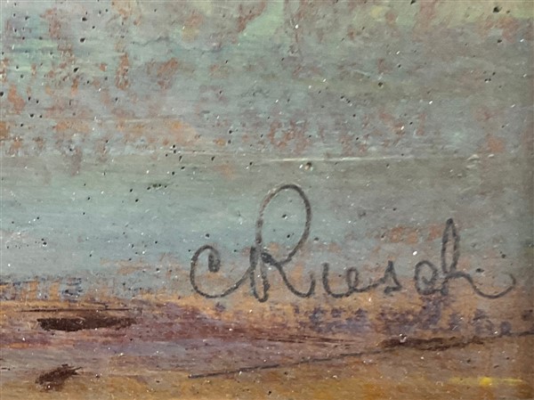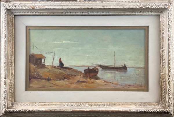 Cesare Riesch "In laguna" olio su compensato (cm 21x40) firmato in basso a dest