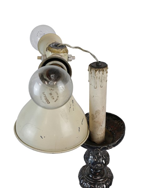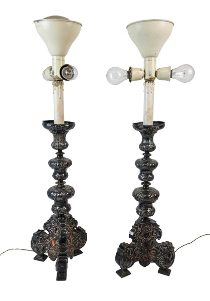 Coppia di portaceri in rame sbalzato e argentato con decoro a volute, motivi fogliacei e teste d'angelo. Secolo XVIII (h cm 53,5) adattati a lampade in epoca successiva (difetti e restauri)