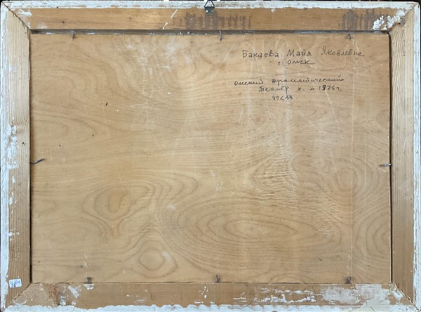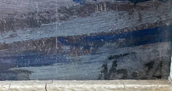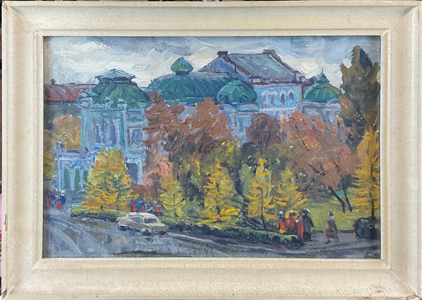 Firma indecifrata "Scorcio cittadino con strada e alberi" 1976, olio su compensato (cm 33x49) siglata e datata in basso a destra; iscritta in cirillico al retro