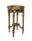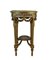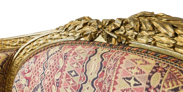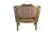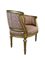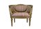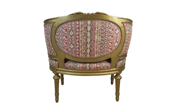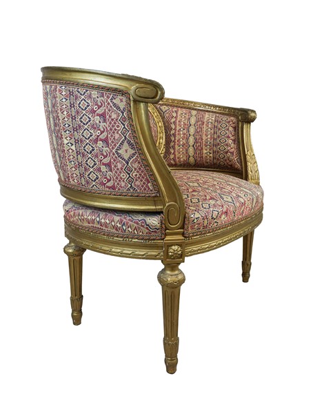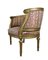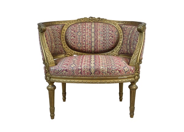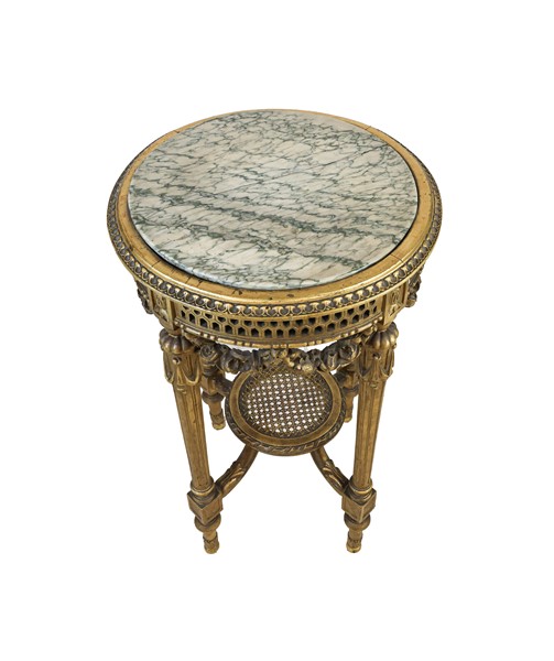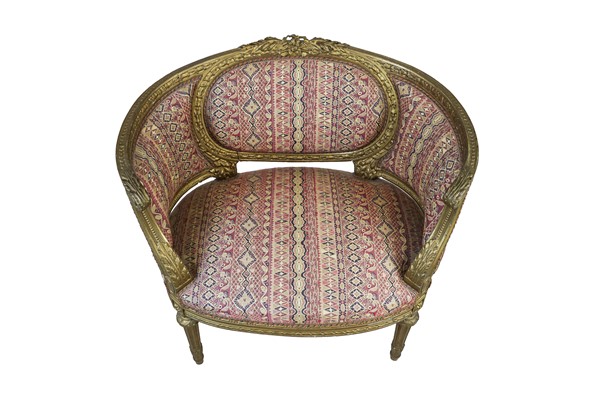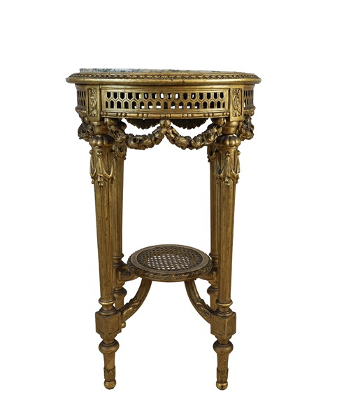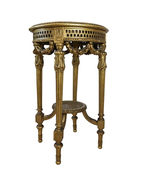 Lotto composto da una coppia di poltrone a pozzetto ed un tavolino in legno intagliato e dorato con piano in marmo, gambe scanalate e bordure a foglie (h cm 75) (difetti)