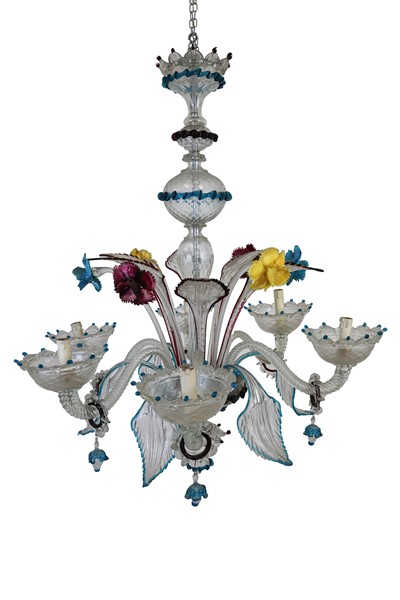 Manifattura di Murano. Lampadario a sei luci in vetro con pendenti a foglie e fiori policromi (h cm 100 ca.) (difetti e mancanze)