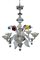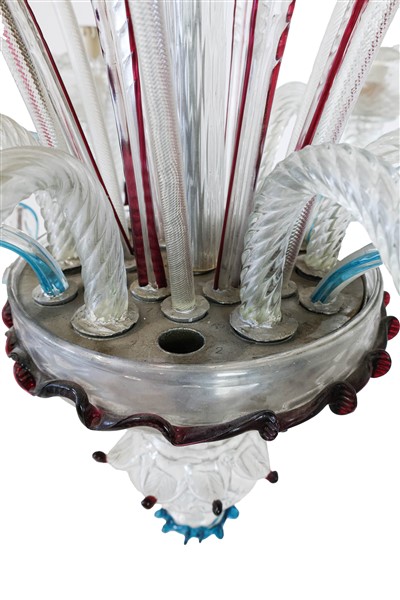 Manifattura di Murano. Lampadario a sei luci in vetro con pendenti a foglie e f