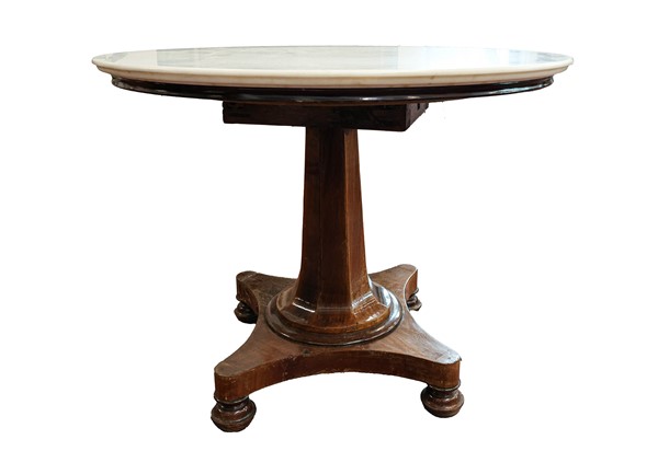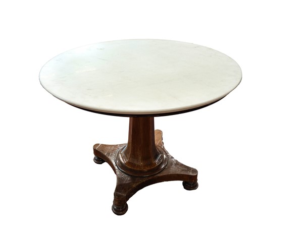 Tavolo circolare in legno con piano in marmo bianco (h. cm 76 d. cm 101) (difetti)