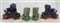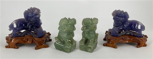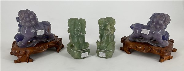 Lotto composto da una coppia di cani di Pho in pietra dura su basi sagomate in legno e una coppia di cani di Pho in pietra dura verde (lievi difetti)