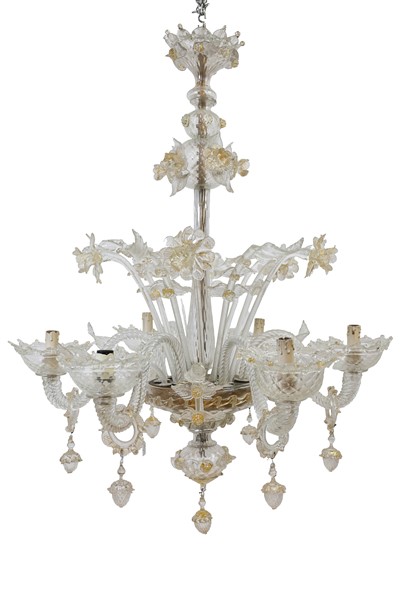 Manifattura di Murano. Lampadario a sei luci in vetro con bracci ritorti e deco