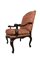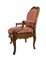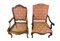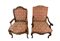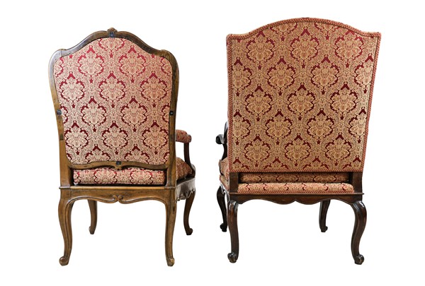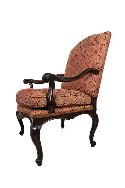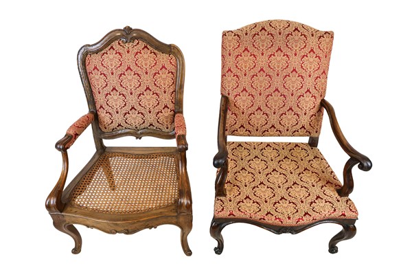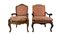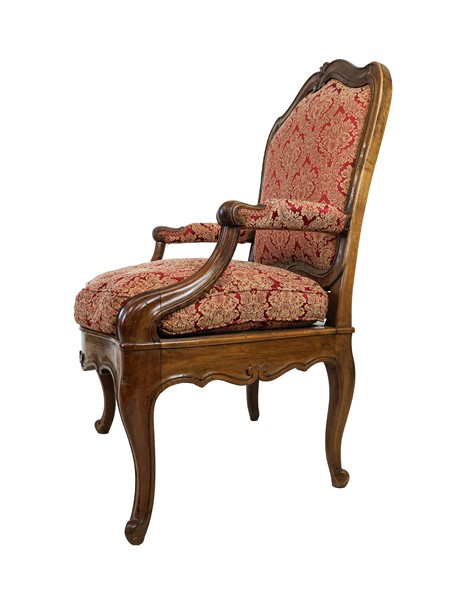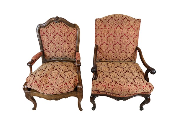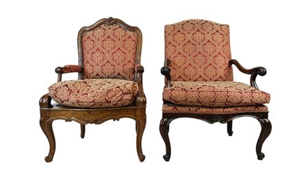 Due poltrone in noce con braccioli e gambe mosse. Secolo XVIII. Rivestimento in tessuto operato nei toni del rosso (difetti e restauri)
