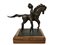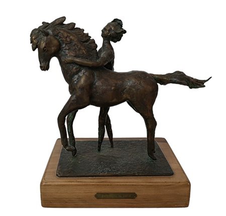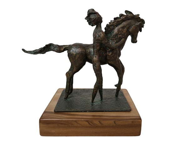Scultura di figura con cavallo in bronzo, poggiante su base in legno (h bronzo cm 25) firmata e datata 93 alla base