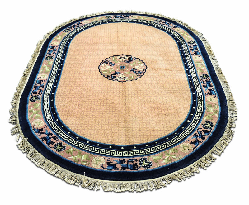 TAPPETO CINESE OVALE - OVAL CHINESE RUG fondo rosa e beige, campo con motivi floreali e medaglione centrale, bordura nei toni del blu, rosa e beige cm 248x171