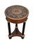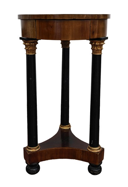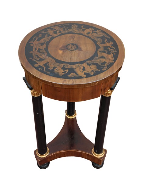 Tavolino tondo lastronato in legni vari con tre colonne ebanizzate e capitelli in legno intagliato e dorato, piano dipinto in monocromia a figure mitologiche con cassetto nella fascia (h cm 78, d cm 44) (difetti)