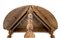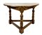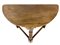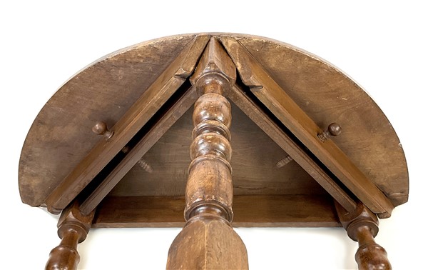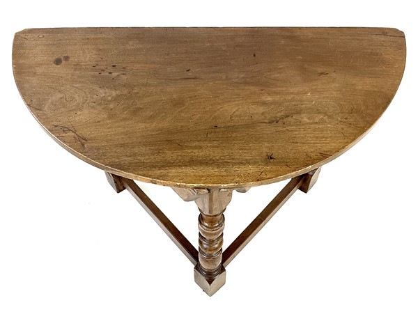 Tavolo da parete con piano a mezza luna in noce, gambe tornite riunite da trave