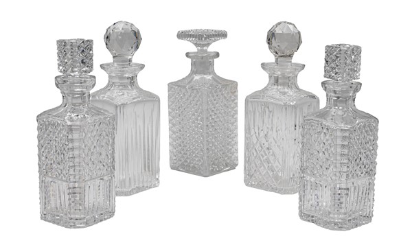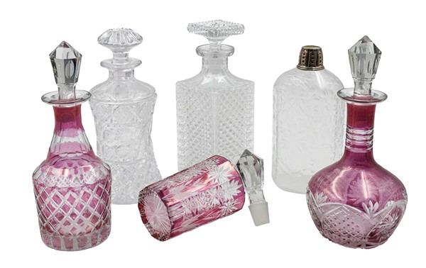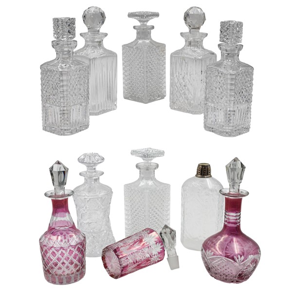Lotto 1849 | Collezione di bottiglie in vetro e cristallo sfaccettato, misure diverse (difet