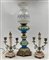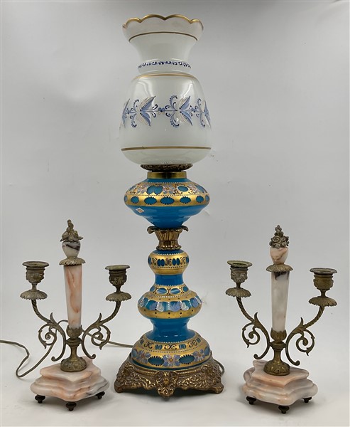 Lotto composto da una lampada da tavolo in vetro opalino con fasce dorate e decori a freddo (h cm 59), ed una coppia di candelabri a due fiamme in alabastro e metallo dorato (h cm 28) (difetti)