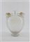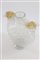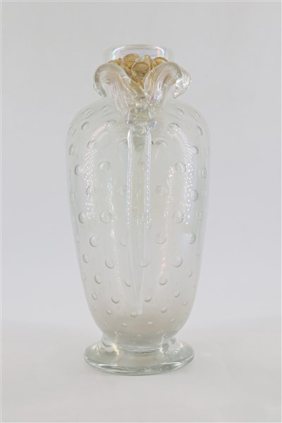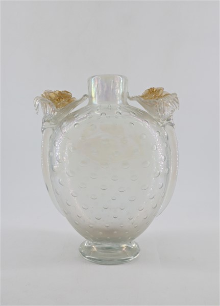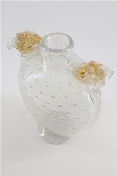 Vaso in vetro soffiato incolore con inclusione di bolle regolari e due morise a foma di fiori applicate a caldo. Murano, seconda metà secolo XX. (cm 18x22) (gravi difetti e mancanze)