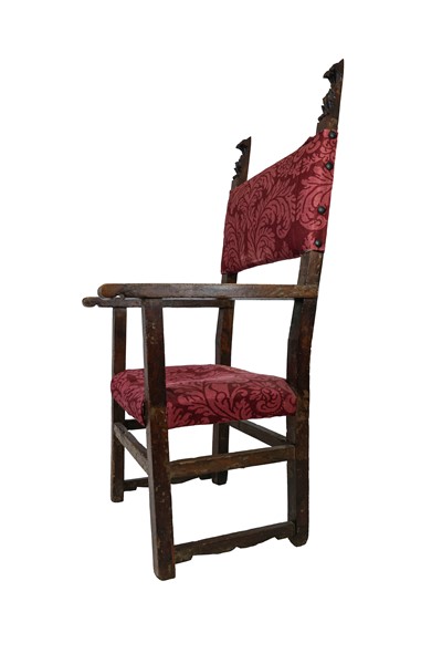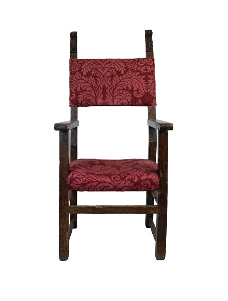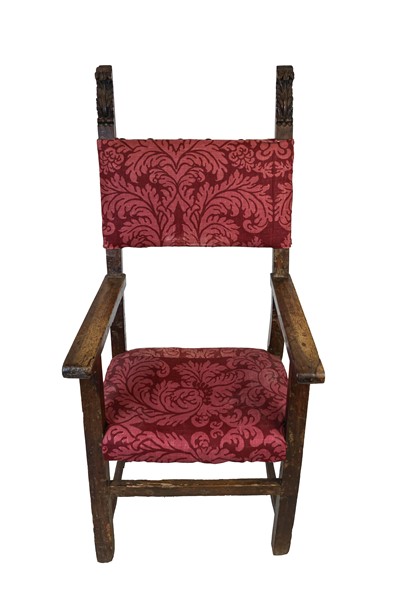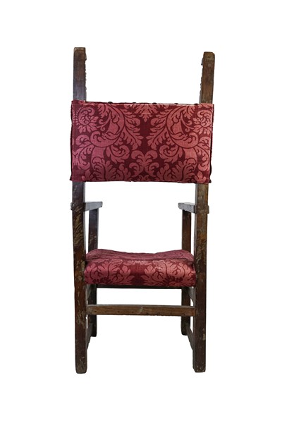 Lotto 1873 | Antico scranno con montanti e gambe squadrati, terminali intagliati, seduta e s