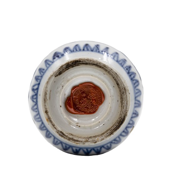 Gruppo di quattro vasi in porcellana decorati in blu con fiori, paesaggi e decori geometrici. Cina, Kangxi (1662-1722) (h. max cm 16) (difetti)