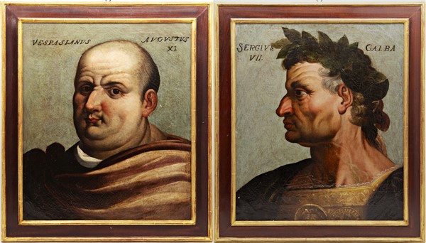 Coppia di dipinti ad olio su tela raffiguranti "Ritratto dell'imperatore romano Sergio Galba" e "Ritratto dell'imperatore romano Vespasiano"