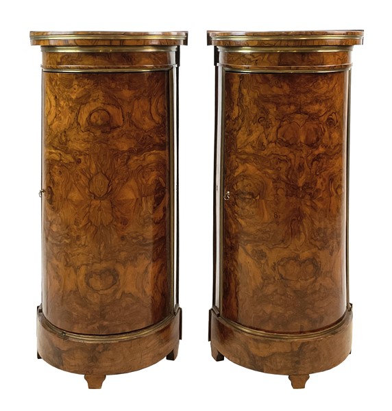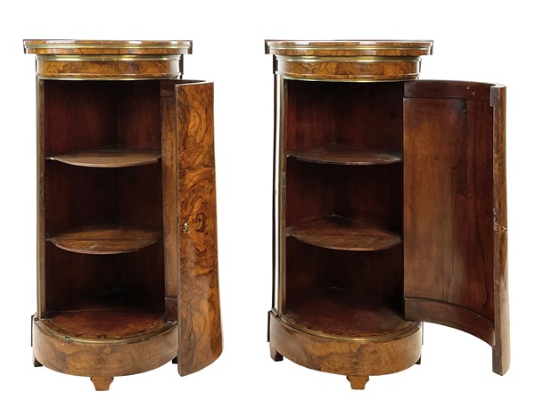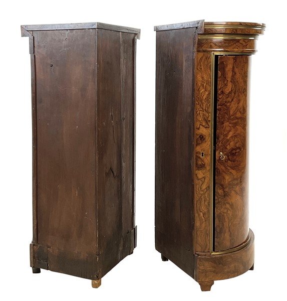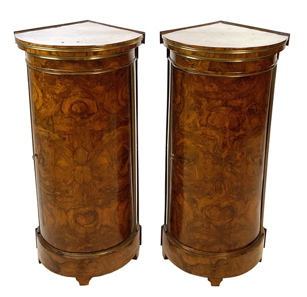 Lotto 1896 | Coppia di cantonali impiallacciati in radica ad un'anta convessa, bordure in ot