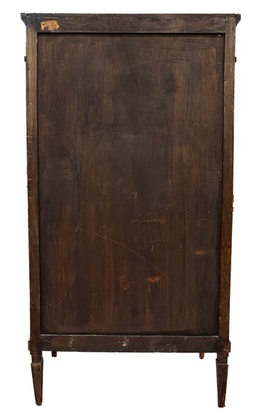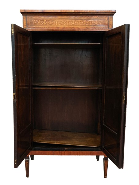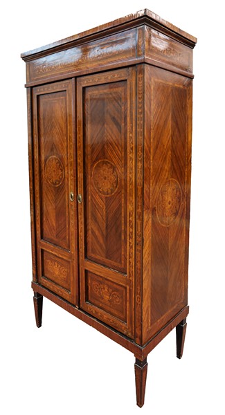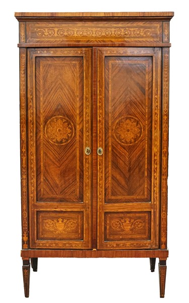 Armadio impiallacciato e intarsiato in legni vari a due ante centrate da rosone