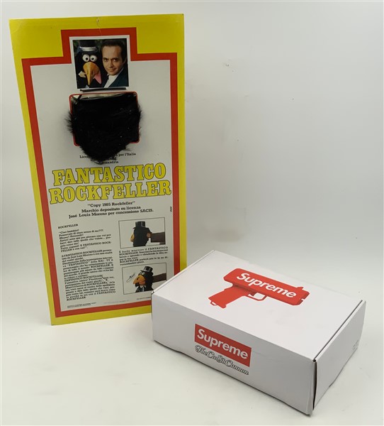 Lotto composto da Supreme "Money Gun Cash Cannon" e pupazzo "Fantastico Rockfeller" in materiali vari (difetti)
