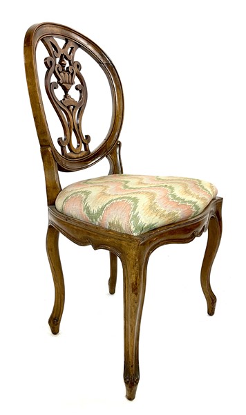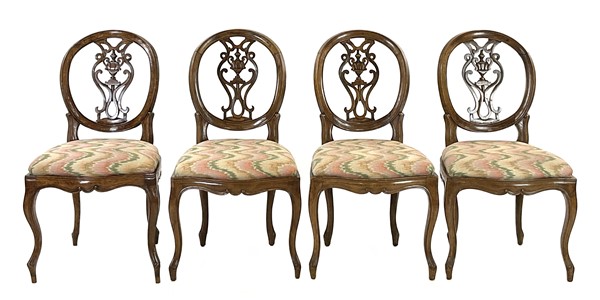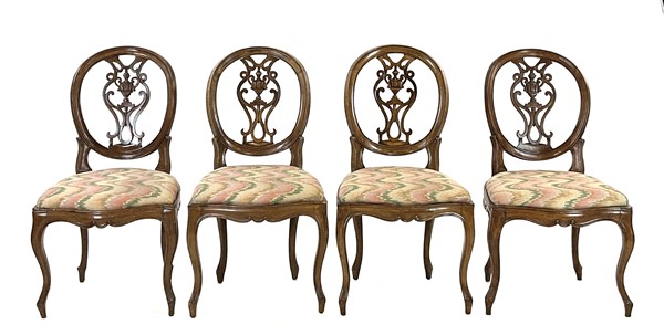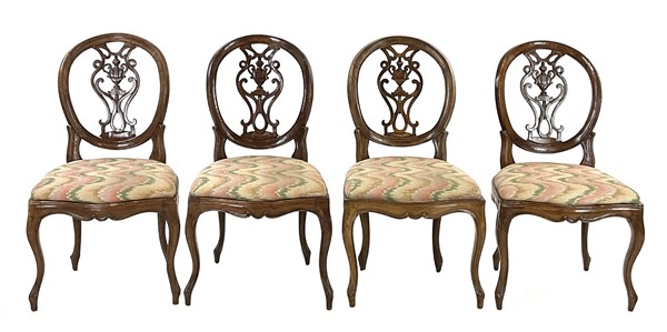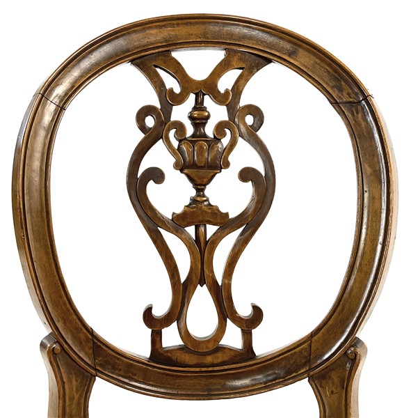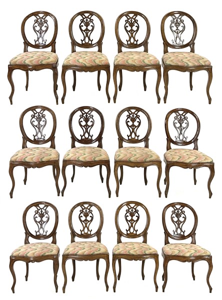 Gruppo di dodici sedie in noce con schienale a medaglione centrato da cartella intagliata a vaso entro volute, gambe mosse. Secolo XIX (difetti e restauri)