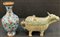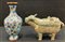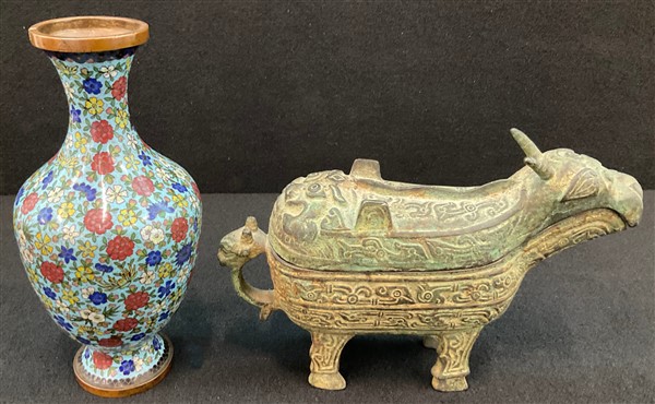 Vaso cloisonnè e tapiro in bronzo in stile arcaico. Cina, secolo XX (h. max cm 20) (difetti)