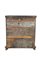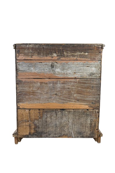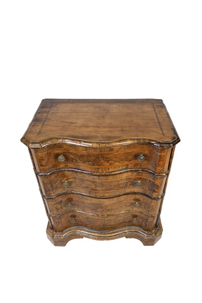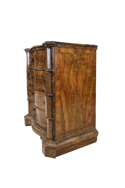 Lotto 1942 | Antico comodino lastronato in noce e filettato a legno chiaro con fronte mosso