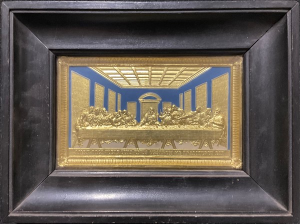 Ignoto secolo XIX. "Utima cena" altorilievo in metallo dorato con dettagli in smalto blu (cm 10x20) In cornice coeva