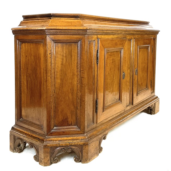 Credenza scantonata in noce a due ante pannellate con profilo superiore dentellato, piedi a mensola intagliati a volute. Secolo XVIII (cm 177x101x59) (difetti e restauri)