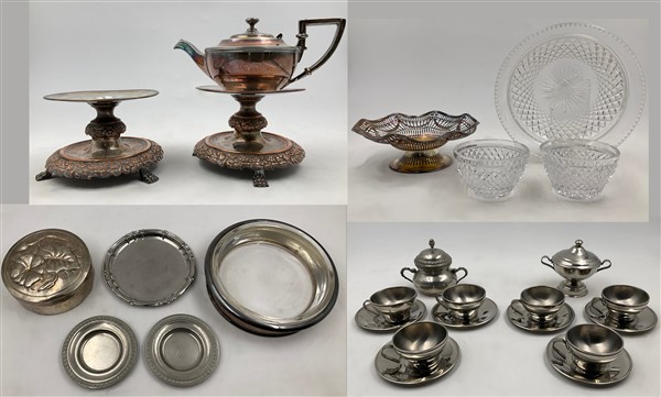 Lotto 1958 | Cartone contenente numerosi oggetti in metallo argentato di forme, usi e decori