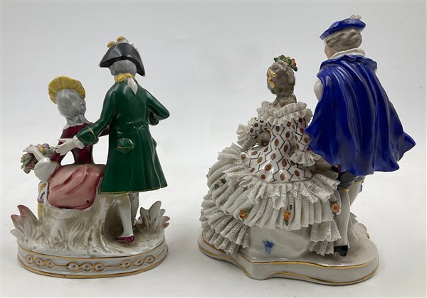 Due gruppi in porcellana policroma con profili in oro raffiguranti scene galanti (h max cm 16) (difetti)