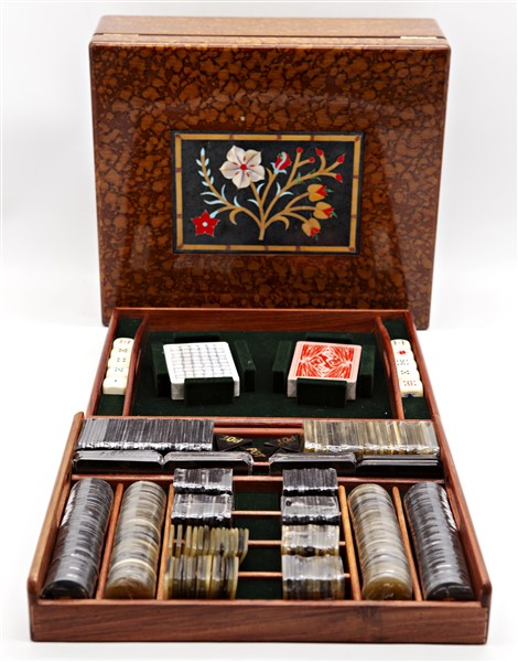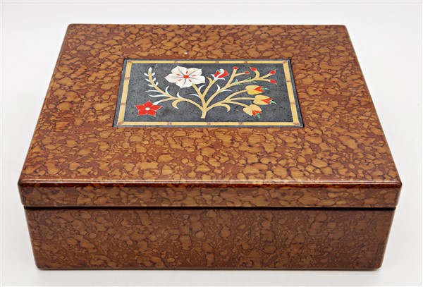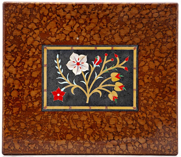 Scatola da gioco lastronata in radica con coperchio centrato da commesso in pietre dure con inserti in madreperla (cm 35x12x30) (lievi difetti)
