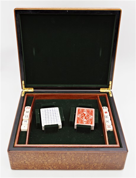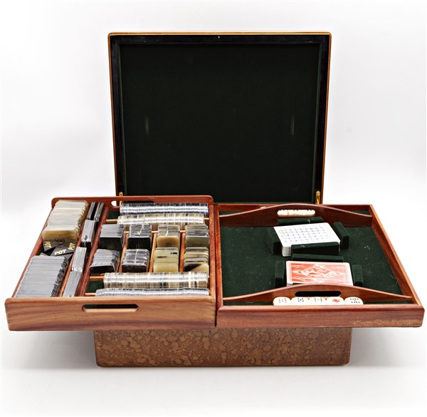 Scatola da gioco lastronata in radica con coperchio centrato da commesso in pie