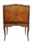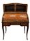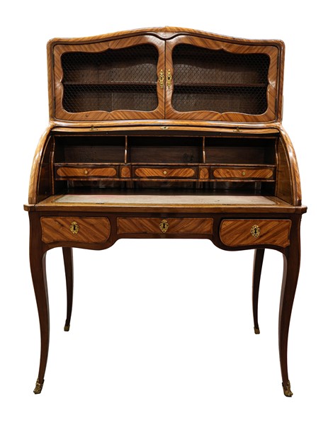Scrittoio da centro con serrandina a rullo lastronato e filettato in legni vari d varie essenza. Piano estraibile, con tiretti e vani interni, l’alzata con doppia anta a giorno e grate in metallo, tre diversi cassettini nella fascia. Gambe mosse, scarpette e guarnizioni in metallo dorato. Secolo XIX (cm 110x140x50) (difetti)